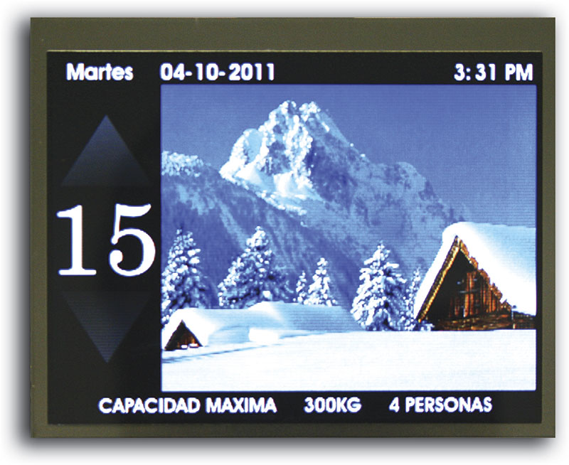 Indicador color de posición, flechas direccionales, fecha y hora, capacidad máxima e información de funcionamiento del ascensor.